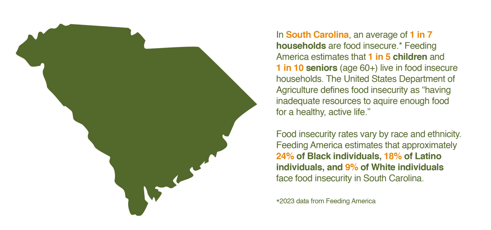 People face hunger in every county in South Carolina. As transportation and rent costs increase, COVID-19 response programs end, and inflation rises, individuals and families are facing food insecurity at significantly increased rates and continue to need help. To address these ongoing needs, food banks require our support more than ever to put food on the table for these neighbors–especially children and seniors.